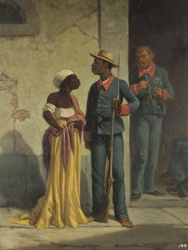 Keywords: Conversación en la calle - Víctor Patrício de Landaluze - 164.jpg Artwork Creator Víctor Patrício de Landaluze Representació d'una escena de carrer en la qual un soldat negre amb uniforme i fusell dotat de baioneta parla amb una dona també negra mentre un altre militar negre condecorat -amagat darrera la cantonada i en segon terme- els observa between Oil on canvas cm Institution Biblioteca Museu Víctor Balaguer object history exhibition history credit line accession number 164 place of creation Biblioteca Museu Víctor Balaguer-cooperation PD-Art PD-old-100-1923 Uploaded with UploadWizard Paintings in the Biblioteca Museu Víctor Balaguer Víctor Patrício de Landaluze |