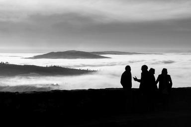 Keywords: conversation high altitude grianan of aileach mountain top ring fort black white black white communication people talking conversion woman male
