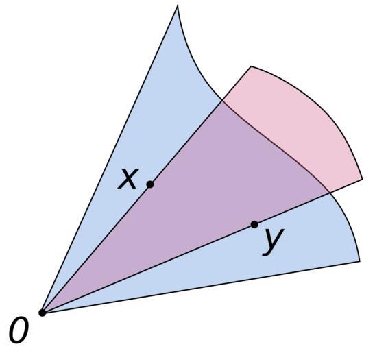 | Keywords: Convex cone illust.svg A convex cone light blue Inside of it the light red convex cone consists of all points αx + βy with α>0 and β>0 for the depicted x and y The curves on the upper right symbolize that the regions are infinite in extent L'insieme azzurro è un cono convesso L'insieme in viola corrisponde al cono convesso generato da x e y Own Oleg Alexandrov Made with Inkscape Convex geometry Optimization Files by User Oleg Alexandrov from en wikipedia | ||||