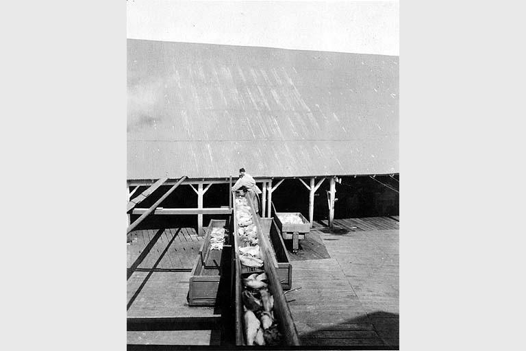 | Keywords: Conveyor belt carrying salmon at the Alaska Packers Association cannery at Clark's Point, Nushagak Bay, Alaska, July 1918 (COBB 119).jpeg check categories 29 December 2015 2 Photograph Creator John Nathan Cobb On verso of image Elevator carrying dressed fish from fish house to N C cannery Clark's Point Alaska July 1918 Subjects LCTGM Canneries--Alaska--Clark's Point; Cannery workers--Alaska--Clark's Point Subjects LCSH Alaska Packers Association; Salmon canning industry--Alaska--Clark's Point; Conveyor belts--Alaska--Clark's Point depicted place United States--Alaska--Clark's Point 1918 silver gelatin b w Institution University of Washington UWASH-JNCobb-source accession number 119 PD-old-auto-1923 1930 Information field Order Number COB049 Images from the John N Cobb Photograph Collection to check Canneries in Alaska Conveyor belts |