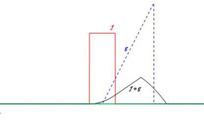 | Keywords: Convolution Animation (Boxcar and Ramp).gif en An animation of the convolution of two functions f t and g t <math>f t 0 7 \left H\left x+\frac 1 4 \right - H\left x-\frac 1 4 \right \right</math> <math>g t \begin cases t 0 \le t < 1 \\ 0 \mbox otherwise \end cases </math> where H x is the Heaviside step function Also shown is the time-reversed and shifted g ˆ’t in solid blue the product f t g ˆ’t green and the convolution h t f t ˆ— g t black equal to the area of the product at the particular own Inductiveload 2009-03-05 Mathematica Code <pre><nowiki> Function definitions boxcarx_ a_ b_ UnitStepx - a - UnitStepx - b; ft_ 0 7 boxcart -1/4 1/4 ; gt_ Piecewise 0 t < 0 t 0 < t < 1 0 t > 1 ; hy_ Module t Convolveft gt t y ; Parts of the drawing that only need to be computed once constplots Plot ft gt ht t -2 2 PlotStyle -> Red Blue Dashed Black ClippingStyle -> False Axes -> False Exclusions -> False ; anim TableShow The plots we generated earlier constplots Plot the time reversed gt g\Tau-t Plotg\Tau - t t -5 5 PlotPoints -> 100 ClippingStyle -> False PlotStyle -> Blue Exclusions -> False Axes -> False Plot the product of the ft and g\Tau-t Plotft g\Tau - t t -5 5 PlotPoints -> 100 ClippingStyle -> False Filling -> Axis FillingStyle -> DirectiveGreen Opacity0 2 PlotStyle -> Green Exclusions -> False Axes -> False Plot the embellishments Graphics Blue Line \Tau -0 05 \Tau 1 1 Red Textf 2 76 Background -> None Blue Textg 48 55 Background -> None Blue Text g \Tau-t \Tau - 58 4 Background -> None Green Text f t g \Tau-t \Tau - 0 55 -0 04 Background -> None Black TextStarf g 65 15 Background -> None Blue Text \Tau \Tau -0 1 Background -> White PlotRange -> -1 9 1 9 - 2 1 \Tau -2 2 025 Table index is the time delay ; ListAnimateanim </nowiki></pre> Convolution |