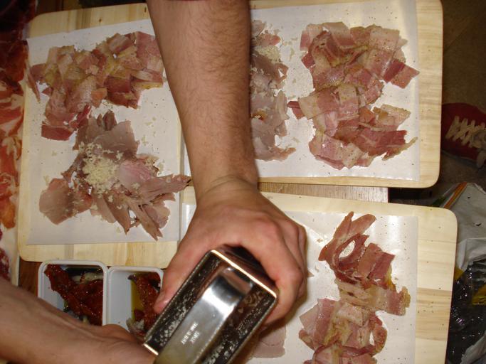 Keywords: Cooked ham served on wooden boards.jpg it salumi prosciutto cotto es fiambres jamon cocido fuente propia Florenciak 11 12 2010 Cc-zero Meat dishes of Slovenia Ham from Italy Food preparation Human hands holding objects Graters