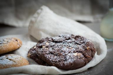 Keywords: cookie dark cookie chocolate cookie schokocookie food baked food nutrition delicious eat frisch bakery sweet pastries food-photography small cakes close chocolate chip cookies baked goods treat chocolate fine pastry nibble even baked calories edible icing sugar sweetness
