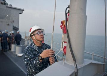 Keywords: Cooperation Afloat Readiness and Training 2012 120614-N-HI414-023.jpg en Hospitalman Andrew E Carpio assigned to the medical department aboard the amphibious dock landing ship USS Germantown LSD 42 raises the union jack flag during morning colors Germantown is at anchor off the coast of Pulau Pangkor Malaysia in preparation for Cooperation Afloat Readiness and Training Malaysia 2012 CARAT 2012 is a nine-country bilateral exercise between the United States and Bangladesh Brunei Cambodia Indonesia Malaysia Singapore the Philippines Thailand and Timor Leste and is designed to enhance maritime security skills and operational cohesiveness among participating forces U S Navy photo by Mass Communication Specialist 3rd Class Gregory A Harden II/Released 2012-06-14 Petty Officer 3rd Class Gregory Harden https //www dvidshub net/image/603445 120614-N-HI414-023 2012-06-15 05 10 STRAIT OF MALACCA MY PD-USGov-Military-Navy Cooperation Afloat Readiness and Training 2012 USS Germantown LSD-42 Images from DoD uploaded by Fæ