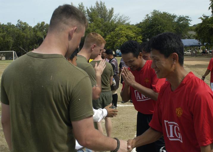 | Keywords: Cooperation Readiness Afloat and Training Thailand 2009 DVIDS187803.jpg en U S Marines embarked aboard the dock landing ship USS Harpers Ferry greet opposing Thai soccer players during a sports day for Cooperation Readiness Afloat and Training Thailand 2009 CARAT is a series of bilateral exercises held annually in Southeast Asia to strengthen relationships and enhance the operational readiness of the participating forces 2009-07-12 Petty Officer 2nd Class Jason Tross https //www dvidshub net/image/187803 090712-N-+++++-183 2009-07-15 23 17 SATTAHIP TH PD-USGov-Military-Navy Sattahip Images from DoD uploaded by Fæ |
