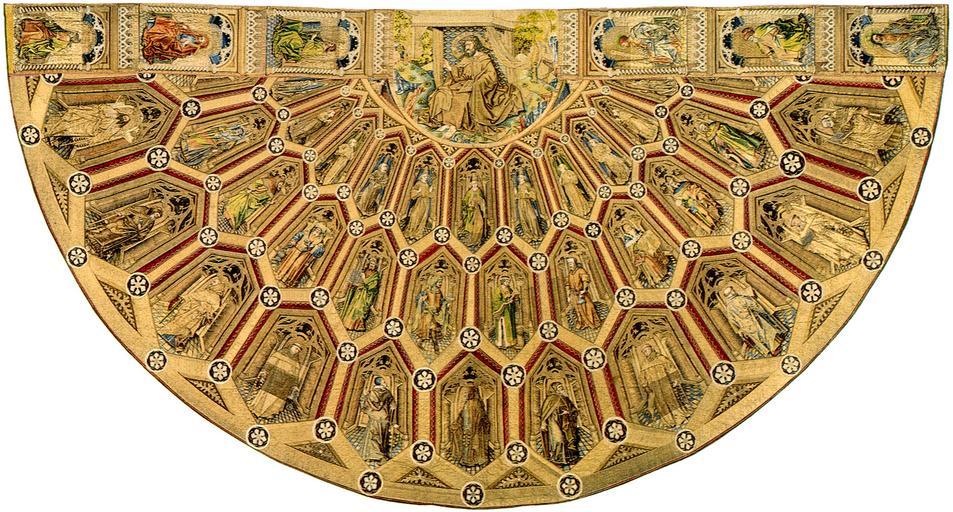 Keywords: Cope-of-saint-john-1904.jpg The Liturgical Vestments of the Order of the Golden Fleece The Cope of Saint John Gold silver and silk embroidery pearls glass beads and velvet applique on linen about 165 cm radius Vienna Kunsthistorisches Museum Creation Between 1433 and 1442 Robert Campin designed three embroidered copes commissioned by Philip the Good These copes were probably produced in the workshop of Thierry du Chastel an embroider who originally came from Paris The vestment worn at the prayer services of the order of the Golden Fleece may be regarded as an artistic response to the Ghent Altarpiece by the van Eyck brothers completed in 1432 Thürleman Felix Robert Campin A monographic study with a critical catalogue 2002 Prestel W 330 cm L 164 cm KK Inv No 21 http //www aiwaz net/panopticon/cope-of-saint-john/gi1904c163 www aiwaz net 1432 creator Robert Campin PD-old-100 Embroidered copes commissioned by Philip the Good |