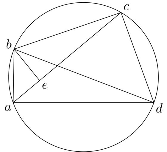 | Keywords: Coppernicus 006.svg de à ber die Kreisbewegungen der Weltkörper 6 File Kreisbewegungen-Coppernicus-0 djvu p 34 1879 w Nicolaus Copernicus File Coppernicus6 png PD-old-100 De revolutionibus drawings LaTeX Source Code <syntaxhighlight lang latex > complile with »pdflatex« \documentclasstikz convert pdf2svg standalone \usetikzlibrary calc intersections \begin document \begin tikzpicture \draw 0 0 circleradius 2; \coordinate A at 200 2 ; \coordinate B at 158 2 ; \coordinate C at 60 2 ; \coordinate D at -20 2 ; \path B ; \pgfgetlastxy \xB \yB \path C ; \pgfgetlastxy \xC \yC \path D ; \pgfgetlastxy \xD \yD \pgfmathanglebetweenlines \pgfpoint \xB \yB \pgfpoint \xD \yD \pgfpoint \xB \yB \pgfpoint \xC \yC \pgfmathsetmacro \angCBD \pgfmathresult ; \draw A -- B -- C -- D --cycle; \draw B -- D ; \pathdraw name path lineAC A -- C ; \pathname path lineBE B -- B 1 \angCBD A ; \pathname intersections of lineAC and lineBE name section ; \coordinate E at section-1 ; \draw B -- E ; \draw A + -135 0 2 node a ; \draw B + 135 0 2 node b ; \draw C + 45 0 2 node c ; \draw D + -45 0 2 node d ; \draw E + -45 0 2 node e ; \end tikzpicture \end document </syntaxhighlight> |
