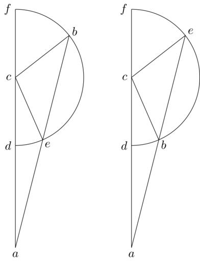 | Keywords: Coppernicus 018.svg de à ber die Kreisbewegungen der Weltkörper 18 File Kreisbewegungen-Coppernicus-0 djvu p 45 1879 w Nicolaus Copernicus File Coppernicus_018 png PD-old-100 De revolutionibus drawings LaTeX Source Code <syntaxhighlight lang latex > complile with »pdflatex« \documentclasstikz convert pdf2svg standalone \usetikzlibrary calc intersections \begin document \begin tikzpicture \coordinate A at -90 5 ; \coordinate B at 38 2 ; \coordinate C at 0 0 ; \coordinate D at -90 2 ; \coordinate F at 90 2 ; \pathdraw name path circleDF D arcstart angle -90 end angle 90 radius 2; \pathdraw name path lineAB A -- B ; \pathname intersections of lineAB and circleDF name sectionE ; \coordinate E at sectionE-1 ; \draw A -- F ; \draw C -- B ; \draw C -- E ; \draw A nodebelow a ; \draw B + 38 0 2 node b ; \draw C nodeleft c ; \draw D nodeleft d ; \draw E + -45 0 2 node e ; \draw F nodeleft f ; \coordinate C2 at 3 4 0 ; \coordinate A2 at C2 + -90 5 ; \coordinate D2 at C2 + -90 2 ; \coordinate E2 at C2 + 38 2 ; \coordinate F2 at C2 + 90 2 ; \pathdraw name path circleD2F2 D2 arcstart angle -90 end angle 90 radius 2; \pathdraw name path lineA2E2 A2 -- E2 ; \pathname intersections of lineA2E2 and circleD2F2 name sectionB2 ; \coordinate B2 at sectionB2-1 ; \draw A2 -- F2 ; \draw C2 -- E2 ; \draw C2 -- B2 ; \draw A2 nodebelow a ; \draw B2 + -45 0 2 node b ; \draw C2 nodeleft c ; \draw D2 nodeleft d ; \draw E2 + 38 0 2 node e ; \draw F2 nodeleft f ; \end tikzpicture \end document </syntaxhighlight> |