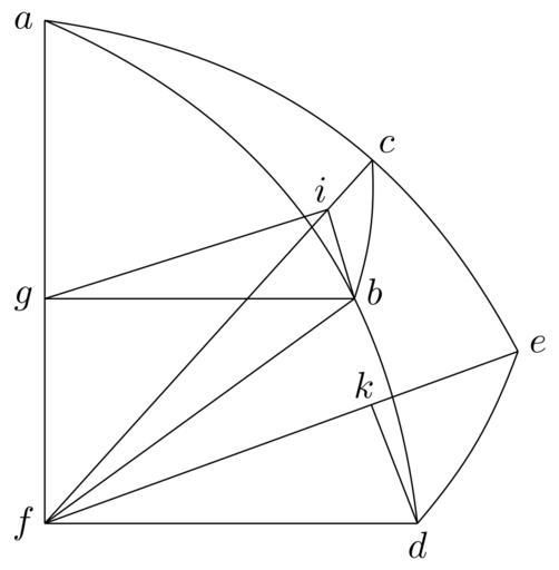 | Keywords: Coppernicus 019.svg de à ber die Kreisbewegungen der Weltkörper 19 File Kreisbewegungen-Coppernicus-0 djvu p 47 1879 w Nicolaus Copernicus File Coppernicus_019 png PD-old-100 De revolutionibus drawings LaTeX Source Code <syntaxhighlight lang latex > complile with »pdflatex« \documentclasstikz convert pdf2svg standalone \usetikzlibrary calc intersections \begin document \begin tikzpicture \pgfmathsetmacro \radius 4 75 \coordinate A at 0 \radius ; \coordinate B' at 36 \radius ; \coordinate C' at 48 \radius+1 ; \coordinate D at 0 74 \radius 0 ; \coordinate E at 20 \radius ; \coordinate F at 0 0 ; \coordinate I at 48 0 84 \radius ; \coordinate K at 20 0 69 \radius ; \pathdraw name path lineAE A tobend left 27 E ; \pathdraw name path lineAD A tobend left 30 D ; \pathname path lineFC' F -- C' ; \pathname intersections of lineAE and lineFC' name sectionC ; \coordinate C at sectionC-1 ; \pathname path lineFB' F -- B' ; \pathname intersections of lineAD and lineFB' name sectionB ; \coordinate B at sectionB-1 ; \coordinate G at F - B ; \draw C tobend left 10 B ; \draw E tobend left 10 D ; \draw F -- A ; \draw F -- D ; \draw F -- E ; \draw F -- B ; \draw F -- C ; \draw K -- D ; \draw I -- B ; \draw G -- B ; \draw G -- I ; \draw A + 180 0 2 node a ; \draw B + 20 0 2 node b ; \draw C + 48 0 2 node c ; \draw D + -90 0 2 node d ; \draw E + 20 0 2 node e ; \draw F + 180 0 2 node f ; \draw G + 180 0 2 node g ; \draw I + 110 0 2 node i ; \draw K + 110 0 2 node k ; \end tikzpicture \end document </syntaxhighlight> |