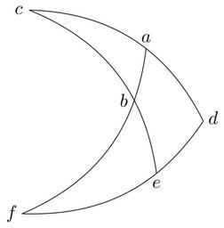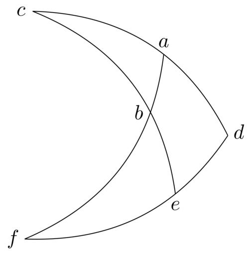 | Keywords: Coppernicus 020.svg de à ber die Kreisbewegungen der Weltkörper 20 File Kreisbewegungen-Coppernicus-0 djvu p 48 1879 w Nicolaus Copernicus File Coppernicus_020 png PD-old-100 De revolutionibus drawings LaTeX Source Code <syntaxhighlight lang latex > complile with »pdflatex« \documentclasstikz convert pdf2svg standalone \usetikzlibrary calc intersections \begin document \begin tikzpicture \pgfmathsetmacro \radius 3 9 \coordinate A' at 53 \radius+1 ; \coordinate C at 88 \radius ; \coordinate D at 27 \radius ; \coordinate E' at C + -52 \radius+1 ; \coordinate F at 0 0 ; \pathdraw name path lineCD C tobend left 31 D ; \pathdraw name path lineFD F tobend right 29 D ; \pathname path lineFA' F -- A' ; \pathname intersections of lineCD and lineFA' name sectionA ; \coordinate A at sectionA-1 ; \pathname path lineCE' C -- E' ; \pathname intersections of lineFD and lineCE' name sectionE ; \coordinate E at sectionE-1 ; \pathdraw name path lineFA F tobend right 30 A ; \pathdraw name path lineCE C tobend left 30 E ; \pathname intersections of lineFA and lineCE name sectionB ; \coordinate B at sectionB-1 ; \draw A + 90 0 2 node a ; \draw B + 180 0 2 node b ; \draw C + 180 0 2 node c ; \draw D + 20 0 2 node d ; \draw E + -90 0 2 node e ; \draw F + 180 0 2 node f ; \end tikzpicture \end document </syntaxhighlight> |