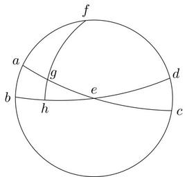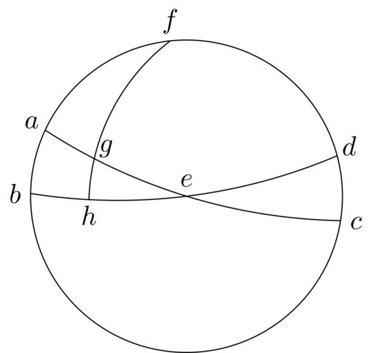 Keywords: Coppernicus 029.svg de à ber die Kreisbewegungen der Weltkörper 29 File Kreisbewegungen-Coppernicus-0 djvu p 61 1879 w Nicolaus Copernicus File Coppernicus_029 png PD-old-100 De revolutionibus drawings LaTeX Source Code <syntaxhighlight lang latex > complile with »pdflatex« \documentclasstikz convert pdf2svg standalone \usepackage tkz-euclide \usetkzobj all \begin document \begin tikzpicture \tkzSetUpLineline width 0 4pt \tkzDefPoint 155 2 A \tkzDefPoint 179 2 B \tkzDefPoint -9 2 C \tkzDefPoint 15 2 D \tkzDefPoint 0 0 E \tkzDefPoint 96 2 F \begin pgfinterruptboundingbox \tkzCircumCenter A E C \tkzGetPoint O1 \tkzCircumCenter B E D \tkzGetPoint O2 \end pgfinterruptboundingbox \tkzDefPointByrotation center O1 angle -10 2 E \tkzGetPoint G \tkzDefPointByrotation center O2 angle -10 E \tkzGetPoint H \begin pgfinterruptboundingbox \tkzCircumCenter F G H \tkzGetPoint O3 \end pgfinterruptboundingbox \tkzDrawCircle E A \tkzDrawArccolor black O1 A C \tkzDrawArccolor black O2 B D \tkzDrawArccolor black O3 F H \draw A + 150 0 2 node a ; \draw B + 180 0 2 node b ; \draw C + -9 0 2 node c ; \draw D + 40 0 2 node d ; \draw E + 90 0 2 node e ; \draw F + 90 0 25 node f ; \draw G + 40 0 2 node g ; \draw H + -90 0 2 node h ; \end tikzpicture \end document </syntaxhighlight> |