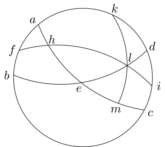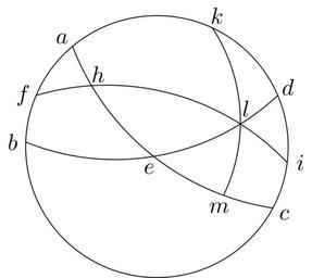 Keywords: Coppernicus 037.svg de à ber die Kreisbewegungen der Weltkörper 37 File Kreisbewegungen-Coppernicus-0 djvu p 80 1879 w Nicolaus Copernicus File Coppernicus_037 png PD-old-100 De revolutionibus drawings LaTeX Source Code <syntaxhighlight lang latex > complile with »pdflatex« \documentclasstikz convert pdf2svg standalone \usepackage tkz-euclide \usetkzobj all \begin document \begin tikzpicture \tkzSetUpLineline width 0 4pt \tkzDefPoint 130 2 A \tkzDefPoint 178 2 B \tkzDefPoint -28 2 C \tkzDefPoint 23 2 D \tkzDefPoint 0 0 E' \tkzDefPoint -0 05 -0 15 E \tkzDefPoint 157 2 F \tkzDefPoint -7 2 I \tkzDefPoint 65 2 K \begin pgfinterruptboundingbox \tkzCircumCenter A E C \tkzGetPoint O1 \tkzCircumCenter B E D \tkzGetPoint O2 \end pgfinterruptboundingbox \tkzDefPointByrotation center O1 angle 18 E \tkzGetPoint M \tkzDefPointByrotation center O2 angle 22 5 E \tkzGetPoint L \begin pgfinterruptboundingbox \tkzCircumCenter K L M \tkzGetPoint O3 \tkzCircumCenter F L I \tkzGetPoint O4 \tkzInterCC O1 A O4 I \tkzGetPoints H2 H \end pgfinterruptboundingbox \tkzDrawCircle E' A \tkzDrawArccolor black O1 A C \tkzDrawArccolor black O2 B D \tkzDrawArccolor black O3 M K \tkzDrawArccolor black O4 I F \draw A + 144 0 2 node a ; \draw B + 180 0 2 node b ; \draw C + -30 0 2 node c ; \draw D + 40 0 2 node d ; \draw E + -110 0 2 node e ; \draw F + 180 0 2 node f ; \draw H + 60 0 2 node h ; \draw I + 0 0 2 node i ; \draw K + 70 0 2 node k ; \draw L + 70 0 25 node l ; \draw M + -110 0 2 node m ; \end tikzpicture \end document </syntaxhighlight> |