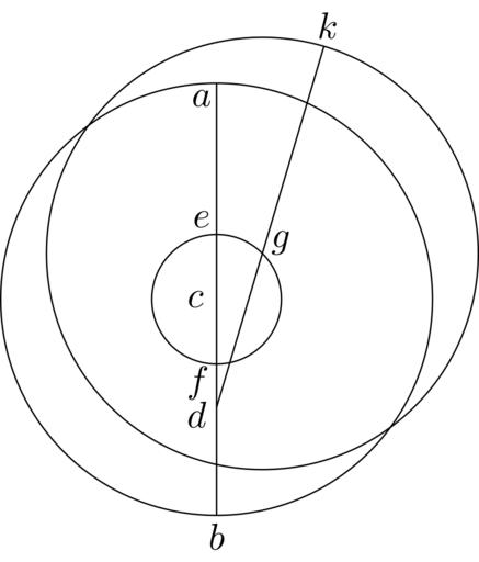 | Keywords: Coppernicus 063.svg de à ber die Kreisbewegungen der Weltkörper 63 File Kreisbewegungen-Coppernicus-0 djvu p 181 1879 w Nicolaus Copernicus File Coppernicus_063 png PD-old-100 De revolutionibus drawings LaTeX Source Code <syntaxhighlight lang latex > complile with »pdflatex« \documentclasstikz convert pdf2svg standalone \usetikzlibrary calc intersections \begin document \begin tikzpicture \pgfmathsetmacro \CA 2 03 ; \pgfmathsetmacro \CE 0 3 \CA ; \coordinate A at 90 \CA ; \coordinate B at -90 \CA ; \coordinate C at 0 0 ; \coordinate D at -90 0 5 \CA ; \coordinate E at 90 \CE ; \coordinate F at -90 \CE ; \coordinate G at 45 \CE ; \coordinate K' at D 2 5 G ; \pathdraw name path circleGK G circleradius \CA; \pathname path lineGK' G -- K' ; \pathname intersections of circleGK and lineGK' name sectionK ; \coordinate K at sectionK-1 ; \draw C circleradius \CA; \draw C circleradius \CE; \draw A -- B ; \draw D -- K ; \draw A + -135 0 2 node a ; \draw B + -90 0 2 node b ; \draw C + 180 0 2 node c ; \draw D + -160 0 2 node d ; \draw E + 135 0 2 node e ; \draw F + -135 0 25 node f ; \draw G + 30 0 2 node g ; \draw K + 80 0 2 node k ; \end tikzpicture \end document </syntaxhighlight> |