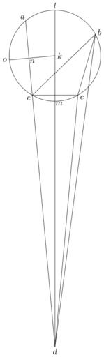 | Keywords: Coppernicus 069.svg de à ber die Kreisbewegungen der Weltkörper 69 File Kreisbewegungen-Coppernicus-0 djvu p 208 1879 w Nicolaus Copernicus File Coppernicus_069 png PD-old-100 De revolutionibus drawings LaTeX Source Code <syntaxhighlight lang latex > complile with »pdflatex« \documentclasstikz convert pdf2svg standalone \usepackage tkz-euclide \usetkzobj all \begin document \begin tikzpicture \tkzSetUpLineline width 0 4pt \pgfmathsetmacro \KL 1 95 ; \tkzDefPoint 130 \KL A \tkzDefPoint 28 \KL B \tkzDefPoint -60 \KL C \tkzDefPoint -90 6 4 \KL D \tkzDefPoint 0 0 K \tkzDefPoint 90 \KL L \tkzDefPoint 90 -\KL M \begin pgfinterruptboundingbox \tkzInterLC A D K A \tkzGetPoints E A \end pgfinterruptboundingbox \coordinate N at A K D ; \tkzInterLC N K K A \tkzGetPoints O O2 \tkzDrawCircle K A \draw A -- D ; \draw B -- D ; \draw C -- D ; \draw C -- E ; \draw B -- C ; \draw L -- D ; \draw B -- E ; \draw O -- K ; \draw A + 130 0 2 node a ; \draw B + 28 0 2 node b ; \draw C + -30 0 2 node c ; \draw D + -90 0 2 node d ; \draw E + -140 0 2 node e ; \draw K + 0 0 2 node k ; \draw L + 90 0 2 node l ; \draw M + -30 0 2 node m ; \draw N + -45 0 2 node n ; \draw O + 180 0 2 node o ; \end tikzpicture \end document </syntaxhighlight> |
