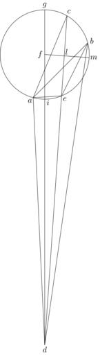 Keywords: Coppernicus 071.svg de à ber die Kreisbewegungen der Weltkörper 71 File Kreisbewegungen-Coppernicus-0 djvu p 212 1879 w Nicolaus Copernicus File Coppernicus_071 png PD-old-100 De revolutionibus drawings LaTeX Source Code <syntaxhighlight lang latex > complile with »pdflatex« \documentclasstikz convert pdf2svg standalone \usepackage tkz-euclide \usetkzobj all \begin document \begin tikzpicture \tkzSetUpLineline width 0 4pt \pgfmathsetmacro \FG 1 94 ; \tkzDefPoint -105 \FG A \tkzDefPoint 15 \FG B \tkzDefPoint 60 \FG C \tkzDefPoint -90 6 5 \FG D \tkzDefPoint 0 0 F \tkzDefPoint 90 \FG G \tkzDefPoint 90 -\FG I \begin pgfinterruptboundingbox \tkzInterLC C D F C \tkzGetPoints C E \end pgfinterruptboundingbox \coordinate L at C F D ; \tkzInterLC L F F C \tkzGetPoints M M2 \tkzDrawCircle F C \draw C -- D ; \draw C -- A ; \draw B -- D ; \draw A -- D ; \draw A -- E ; \draw B -- A ; \draw G -- D ; \draw B -- E ; \draw M -- F ; \draw A + -135 0 2 node a ; \draw B + 28 0 2 node b ; \draw C + 65 0 2 node c ; \draw D + -90 0 2 node d ; \draw E + -45 0 2 node e ; \draw F + 180 0 2 node f ; \draw G + 90 0 2 node g ; \draw I + -45 0 2 node i ; \draw L + 60 0 2 node l ; \draw M + 0 0 2 node m ; \end tikzpicture \end document </syntaxhighlight>
