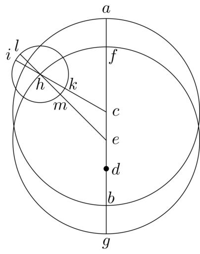 | Keywords: Coppernicus 091.svg de à ber die Kreisbewegungen der Weltkörper 91 File Kreisbewegungen-Coppernicus-0 djvu p 268 1879 w Nicolaus Copernicus File Coppernicus_091 png PD-old-100 De revolutionibus drawings LaTeX Source Code <syntaxhighlight lang latex > complile with »pdflatex« \documentclasstikz convert pdf2svg standalone \usepackage tkz-euclide \usetkzobj all \begin document \begin tikzpicture \pgfmathsetmacro \CA 1 98 ; \pgfmathsetmacro \EC 0 6 ; \pgfmathsetmacro \FEH 135 ; \pgfmathsetmacro \dot 0 05 ; \coordinate A at 90 \CA ; \coordinate B at -90 \CA ; \coordinate C at 0 0 ; \coordinate D at 0 -2 \EC ; \coordinate E at 0 -\EC ; \coordinate F at E + 90 \CA ; \coordinate G at E + -90 \CA ; \coordinate H at E + \FEH \CA ; \coordinate L at H + \FEH \EC ; \begin pgfinterruptboundingbox \tkzInterLC C H H L \tkzGetPoints K I \tkzInterLC E H H L \tkzGetPoints M L \end pgfinterruptboundingbox \draw C circleradius \CA; \draw E circleradius \CA; \draw H circleradius \EC; \drawfill D circleradius \dot; \draw A -- G ; \draw C -- I ; \draw E -- L ; \draw A + 90 0 2 node a ; \draw B + 60 0 2 node b ; \draw C + 0 0 2 node c ; \draw D + 0 0 2 node d ; \draw E + 0 0 2 node e ; \draw F + -55 0 25 node f ; \draw G + -90 0 2 node g ; \draw H + -90 0 2 node h ; \draw I + 140 0 2 node i ; \draw K + 30 0 2 node k ; \draw L + 110 0 2 node l ; \draw M + -90 0 25 node m ; \end tikzpicture \end document </syntaxhighlight> |