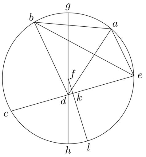 | Keywords: Coppernicus 097.svg de à ber die Kreisbewegungen der Weltkörper 97 File Kreisbewegungen-Coppernicus-0 djvu p 277 1879 w Nicolaus Copernicus File Coppernicus_097 png PD-old-100 De revolutionibus drawings LaTeX Source Code <syntaxhighlight lang latex > complile with »pdflatex« \documentclasstikz convert pdf2svg standalone \usepackage tkz-euclide \usetkzobj all \begin document \begin tikzpicture \tkzSetUpLineline width 0 4pt \pgfmathsetmacro \FA 2 18 ; \tkzDefPoint 49 \FA A \tkzDefPoint 121 \FA B \tkzDefPoint -150 \FA C \tkzDefPoint -90 0 25 \FA D \tkzDefPoint 0 0 F \tkzDefPoint 90 \FA G \tkzDefPoint -90 \FA H \tkzInterLC C D F A \tkzGetPoints E C \coordinate K at C F E ; \tkzInterLC F K F A \tkzGetPoints L2 L \tkzDrawCircle F A \draw A -- B ; \draw A -- D ; \draw A -- E ; \draw B -- D ; \draw B -- E ; \draw C -- E ; \draw F -- L ; \draw G -- H ; \draw A + 50 0 2 node a ; \draw B + 120 0 2 node b ; \draw C + -150 0 2 node c ; \draw D + -130 0 25 node d ; \draw E + 0 0 2 node e ; \draw F + 40 0 2 node f ; \draw G + 90 0 2 node g ; \draw H + -90 0 2 node h ; \draw K + -30 0 25 node k ; \draw L + -80 0 2 node l ; \end tikzpicture \end document </syntaxhighlight> |