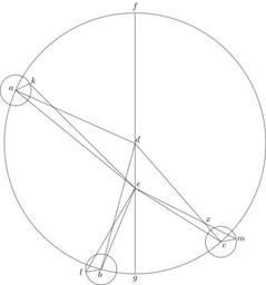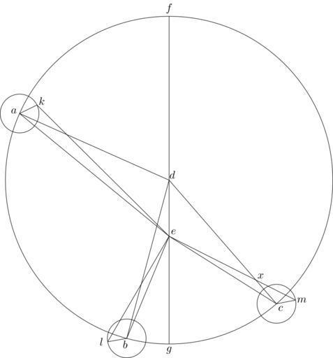 | Keywords: Coppernicus 101.svg  de à ber die Kreisbewegungen der Weltkörper 101 File Kreisbewegungen-Coppernicus-0 djvu p 285 1879 w Nicolaus Copernicus File Coppernicus_101 png PD-old-100 De revolutionibus drawings LaTeX Source Code <syntaxhighlight lang latex > complile with »pdflatex« \documentclasstikz convert pdf2svg standalone \usepackage tkz-euclide \usetkzobj all \begin document \begin tikzpicture \tkzSetUpLineline width 0 4pt \pgfmathsetmacro \DA 5 25 ; \pgfmathsetmacro \AN 0 62 ; \tkzDefPoint 156 \DA A \tkzDefPoint -105 \DA B \tkzDefPoint -49 \DA C \tkzDefPoint 0 0 D \tkzDefPoint -90 2 9 \AN E \tkzDefPoint 90 \DA F \tkzDefPoint -90 \DA G \begin pgfinterruptboundingbox \tkzInterLCR D A A \AN cm \tkzGetPoints K1 K2 \tkzInterLCR D B B \AN cm \tkzGetPoints L1 L2 \tkzInterLCR D C C \AN cm \tkzGetPoints M1 M2 \end pgfinterruptboundingbox \tkzDefPointByrotation center A angle 50 K1 \tkzGetPoint K \tkzDefPointByrotation center B angle 115 L1 \tkzGetPoint L \tkzDefPointByrotation center C angle -120 M1 \tkzGetPoint M \tkzInterLL D C E M \tkzGetPoint X \tkzDrawCircle D A \tkzDrawCircle A K \tkzDrawCircle B L \tkzDrawCircle C M \draw F -- G ; \draw D -- A ; \draw D -- B ; \draw D -- C ; \draw E -- A ; \draw E -- K ; \draw A -- K ; \draw E -- B ; \draw E -- L ; \draw B -- L ; \draw E -- C ; \draw E -- M ; \draw C -- M ; \draw A + 156 0 2 node a ; \draw B + -105 0 2 node b ; \draw C + -49 0 2 node c ; \draw D + 60 0 2 node d ; \draw E + 45 0 2 node e ; \draw F + 90 0 25 node f ; \draw G + -90 0 2 node g ; \draw K + 40 0 2 node k ; \draw L + 180 0 2 node l ; \draw M + 0 0 2 node m ; \draw X + 40 0 2 node x ; \end tikzpicture \end document </syntaxhighlight> |