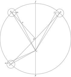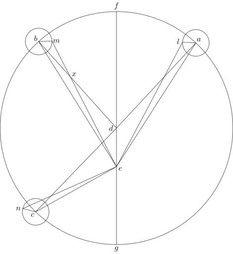 Keywords: Coppernicus 107.svg de à ber die Kreisbewegungen der Weltkörper 107 File Kreisbewegungen-Coppernicus-0 djvu p 294 1879 w Nicolaus Copernicus File Coppernicus_107 png PD-old-100 De revolutionibus drawings LaTeX Source Code <syntaxhighlight lang latex > complile with »pdflatex« \documentclasstikz convert pdf2svg standalone \usepackage tkz-euclide \usetkzobj all \begin document \begin tikzpicture \tkzSetUpLineline width 0 4pt \pgfmathsetmacro \DA 5 25 ; \pgfmathsetmacro \AN 0 6 ; \tkzDefPoint 47 \DA A \tkzDefPoint 132 \DA B \tkzDefPoint -134 \DA C \tkzDefPoint 0 0 D \tkzDefPoint -90 2 9 \AN E \tkzDefPoint 90 \DA F \tkzDefPoint -90 \DA G \begin pgfinterruptboundingbox \tkzInterLCR D A A \AN cm \tkzGetPoints A1 A2 \tkzInterLCR D B B \AN cm \tkzGetPoints B1 B2 \tkzInterLCR D C C \AN cm \tkzGetPoints C1 C2 \end pgfinterruptboundingbox \tkzDefPointByrotation center A angle -50 A1 \tkzGetPoint L \tkzDefPointByrotation center B angle 50 B1 \tkzGetPoint M \tkzDefPointByrotation center C angle 120 C1 \tkzGetPoint N \tkzInterLL D B E M \tkzGetPoint X \tkzDrawCircle D A \tkzDrawCircle A L \tkzDrawCircle B M \tkzDrawCircle C N \draw F -- G ; \draw D -- A ; \draw D -- B ; \draw D -- C ; \draw E -- A ; \draw E -- L ; \draw A -- L ; \draw E -- B ; \draw E -- M ; \draw B -- M ; \draw E -- C ; \draw E -- N ; \draw C -- N ; \draw A + 47 0 2 node a ; \draw B + 132 0 2 node b ; \draw C + -134 0 2 node c ; \draw D + 180 0 25 node d ; \draw E + -30 0 2 node e ; \draw F + 90 0 25 node f ; \draw G + -90 0 2 node g ; \draw L + 170 0 2 node l ; \draw M + 0 0 2 node m ; \draw N + 180 0 2 node n ; \draw X + 30 0 2 node x ; \end tikzpicture \end document </syntaxhighlight>