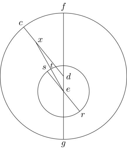 | Keywords: Coppernicus 110.svg de à ber die Kreisbewegungen der Weltkörper 110 File Kreisbewegungen-Coppernicus-0 djvu p 297 1879 w Nicolaus Copernicus File Coppernicus_110 png PD-old-100 De revolutionibus drawings LaTeX Source Code <syntaxhighlight lang latex > complile with »pdflatex« \documentclasstikz convert pdf2svg standalone \usepackage tkz-euclide \usetkzobj all \begin document \begin tikzpicture \tkzSetUpLineline width 0 4pt \pgfmathsetmacro \DC 2 53 ; \tkzDefPoint 129 \DC C \tkzDefPoint 0 0 D \tkzDefPoint -90 0 24 \DC E \tkzDefPoint 90 \DC F \tkzDefPoint -90 \DC G \coordinate X at D 0 7 C ; \coordinate T at E 0 45 X ; \begin pgfinterruptboundingbox \tkzDefLineparallel through E D C \tkzGetPoint C2 \tkzInterLC E C2 E T \tkzGetPoints R S \end pgfinterruptboundingbox \tkzDrawCircle D F \tkzDrawCircle E R \draw F -- G ; \draw D -- C ; \draw E -- X ; \draw S -- R ; \draw C + 127 0 2 node c ; \draw D + 0 0 2 node d ; \draw E + 20 0 2 node e ; \draw F + 90 0 25 node f ; \draw G + -90 0 2 node g ; \draw R + -50 0 2 node r ; \draw S + 127 0 2 node s ; \draw T + 80 0 15 node \footnotesize t ; \draw X + 20 0 2 node x ; \end tikzpicture \end document </syntaxhighlight> |