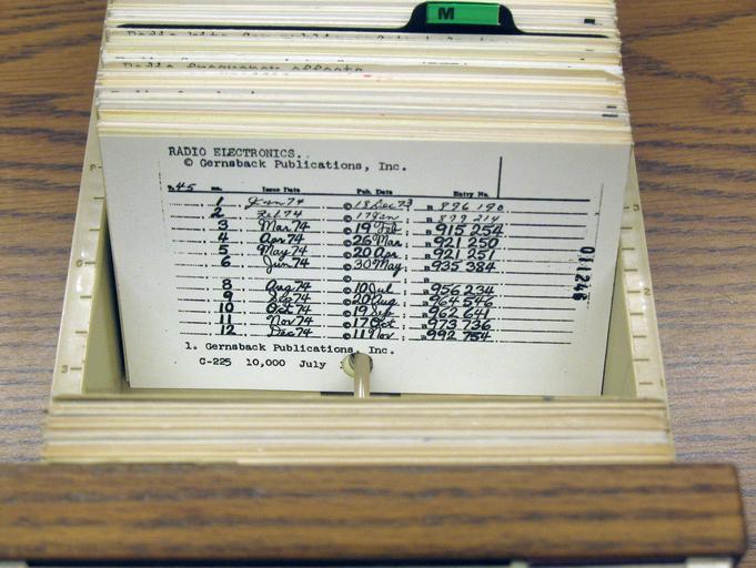 Keywords: Copyright Radio Electronics 1974.jpg en Copyright catalogs at the Library of Congress Located in room LM-404 of the James Madison Memorial Building Washington DC Own Michael Holley Swtpc6800 2009-04-30 File Copyright Card Catalog Files jpg File Copyright Card Catalog Drawer jpg Copyright Office Card catalogs Photographs by User Swtpc6800 |