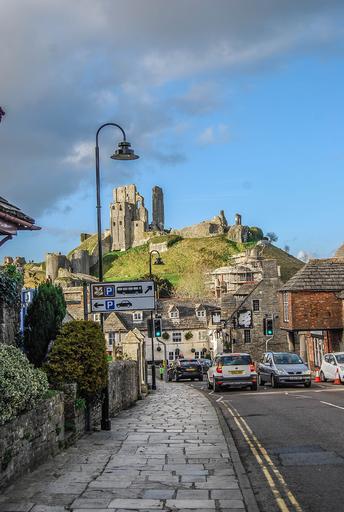 Keywords: corfe castle england sky and clouds street buildings cars clouds