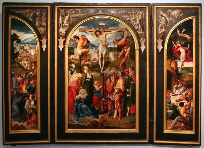 Keywords: Cornelis Engebrechtsz - Triptych with the Crucifixion.jpg workshop of LangSwitch Triptych with the Crucifixion Triptych s ukřižováním Drieluik met de kruisiging<br><br> alternate titles Drieluik met de kruisdraging links de kruisiging midden en de opstanding rechts In de zwikken van links naar rechts Abraham leidt Isaac ten offer de engel weerhoudt Abraham Isaac te offeren de aanbidding van de koperen slang Jonas wordt door het zeemonster uitgespuwd ~ 1520 oil panel LangSwitch left panel linker paneel cm 75 17 5 <br> LangSwitch central panel middenpaneel cm 77 5 46 2 <br> LangSwitch right panel rechter paneel cm 75 17 5 Institution Národní galerie v Praze O 11932 O 11933 O 11934 19319 Ophelia2 Artwork PD-old-100 Photo Renaissance paintings in the Národní galerie v Praze Cornelis Engebrechtsz Early Netherlandish paintings of Jesus Christ bearing the Cross Early Netherlandish paintings of Resurrection of Christ Files by User Ophelia2 Fainting Virgin Mary Triptychs in the Czech Republic 16th-century oil on panel paintings 16th-century paintings of the Crucifixion of Christ 16th-century paintings of Virgin Mary Paintings of the passion of Jesus Christ with multiple episodes |