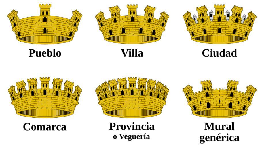 Keywords: Coronas murales.svg Coronas murales Las cinco primeras están reguladas por la Generalitat de Cataluña de acuerdo a la http //www scgenealogia org/index htm SCGHSVN primero mediante el Decreto 263/1991 luego derogado y sustituido por el http //www gencat net/eadop/imatges/4914/07171155 pdf Decreto 139/2007 por el cual se regulan la denominación los símbolos y el registro de entes locales de Cataluña con fecha de publicación de 28 de junio de 2007 De acuerdo con la http //www scgenealogia org/heraldica/heraldcivic htm Introducción general de heráldica cívica las coronas murales pueden ser Veguería o diputación tiene un lienzo de muralla sin puertas y realzado de dieciseis torres almenadas se ven nueve unidas hasta la mitad de su altura por un muro sin almenas Comarca tiene un lienzo de muralla sin puertas y realzado por doce torres almenadas se ven siete unidas hasta la mitad de su altura por un muro sin almenas Ciudad tiene el mismo lienzo de muralla pero cerrado con diez puertas se ven cinco realzado por ocho torres se ven cinco unidas hasta la mitad de su altura por un muro sin almenas con una garita de plata en el medio de la parte superior Villa el lienzo de muralla va cerrado por ocho puertas se ven cuatro y también ocho torres cinco se ven unidas por un muro sin almenas y sin garitas Pueblo es como la de la villa pero solo con cuatro puertas y torres se ven tres de ambas La corona mural genérica está basada en ejemplares en las que no se especifica su tipo Muestra un lienzo de muralla cerrado por ocho puertas cuatro visibles y siete ventanas tres visibles realzado por ocho torres almenadas se ven cuatro unidas hasta la mitad de su altura por un muro almenado Own 2007-11-30 HansenBCN Image Spain Catalunya Heraldica Corones svg SVG coat of arms elements - mural crowns