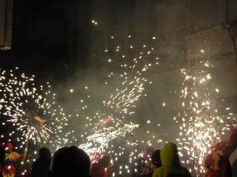 | Keywords: Correfocs (literally in English "fire-runs") are among the most striking features present in Catalan festivals. In the correfoc, a group of individuals will dress as devils and light fireworks - fixed on devil's pitchforks or strung above the route. Dancing to the sound of a rhythmic drum group, they set off their fireworks among crowds of spectators. The spectators that participate dress to protect themselves against small burns and attempt to get as close as possible to the devils... running with the fire. Other spectators will watch from 'safe' distances, rapidly retreating as necessary. culture catalan correfoc terrassa països catalans fmterrassa2016 |
