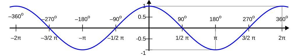 | Keywords: Cos proportional.svg Plot of cos x with proportional scales and the gnuplot source Own pl User Olaf <pre> set terminal svg enhanced font Arial 10 size 658 125 set output 'c \temp\cos svg' set border 0 set style arrow 2 head filled lw 2 size 0 15 30 set style arrow 4 nohead set samples 1000 unset key set xtics axis ÔÇô2¤Ç -2 pi ÔÇô3/2 ¤Ç -1 5 pi ÔÇô¤Ç -pi ÔÇô1/2 ¤Ç -pi/2 1/2 ¤Ç pi/2 ¤Ç pi 3/2 ¤Ç 1 5 pi 2¤Ç 2 pi scale 1 set x2tics axis ÔÇô360 o -2 pi ÔÇô270 o -1 5 pi ÔÇô180 o -pi ÔÇô90 o -pi/2 90 o pi/2 180 o pi 270 o 1 5 pi 360 o 2 pi scale 1 offset 0 2 7 set ytics axis -1 -0 5 0 5 1 set style line 3 lw 1 lt 5 lc rgb black set style line 1 lc rgb blue lw 2 set arrow arrowstyle 2 from -2 pi-0 3 0 to 2 pi+0 3 0 set arrow arrowstyle 2 from 0 -1 05 to 0 1 25 set arrow arrowstyle 4 linestyle 0 from 0 1 to 2 pi 1 set arrow arrowstyle 4 linestyle 0 from 2 pi 1 to 2 pi 0 set arrow arrowstyle 4 linestyle 0 from 0 -1 to pi -1 set arrow arrowstyle 4 linestyle 0 from pi -1 to pi 0 plot -2 pi-0 3 2 pi+0 3 -1 1 cos x linestyle 1 set output unset arrow unset label </pre> SVG trigonometry Cosine function |