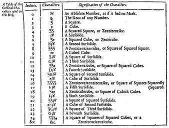 Keywords: Cossical characters.png s form 0 to 24 First known use of Zenzizenzizenzizenzike 2011-12-12 A compleat body of arithmetic in four books Wherein the whole nature of numbers with their simple and comparative elements in all the parts of arithmetick are plainly declared and fully handled Every part explain'd by necessary rules cases theorems questions observations and variety of operations To every part is added excellent rules of practice With many large and exact tables of all sorts of coins weights measures c ancient and modern in most countries reduced to our own London Printed for T Newborough etc Jeake Samuel PD-old-100 Uploaded with UploadWizard Tables information |