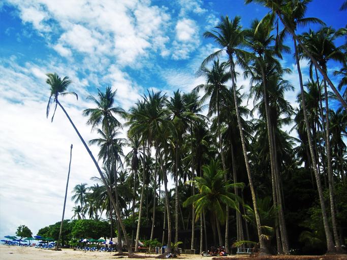 Keywords: costa rica pacific beach high palm trees exotic tropical sky holiday palm trees recovery relaxation paradise beach sun loungers central american land resort palm trees and sky