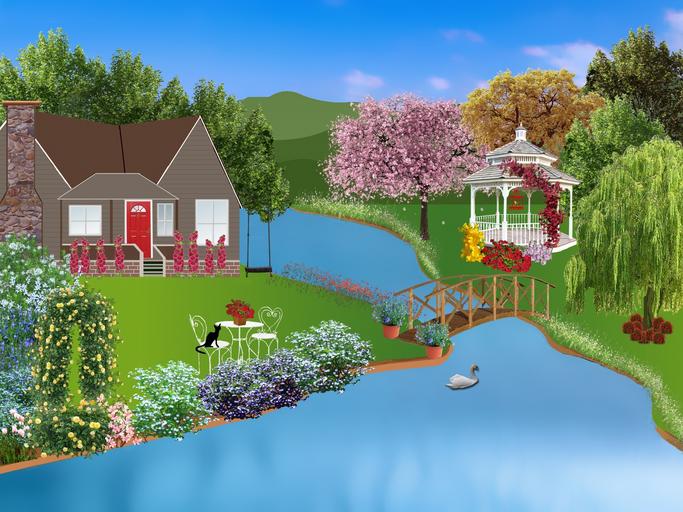 Keywords: cottage pergola flowers river water water's edge house green garden swan bridge culvert roses trémières flowered arch table and chairs cherry blossom black cat cage bird nature landscape summer foliage field