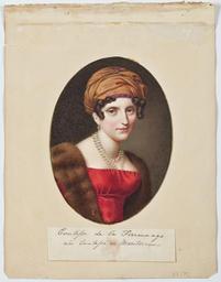 | Keywords: Countess de la Ferronnays (Middleton Album).jpg en The Middleton Watercolor Album consists of a collection of 45 watercolor portraits bound in leather covers with neo-gothic embossing and a gilt bronze clasp in the same style The album relates to the Middleton family of South Carolina from which it descended until Hillwood purchased it in 2004 Williams Middleton who was secretary to his father Henry Middleton the American minister to St Petersburg from 1820 to 1830 assembled this album The artist of many of the watercolors most of which are unsigned is likely Middleton's sister Maria Henrietta who studied painting during her years in St Petersburg with her governess Madame Mathes who also painted miniatures Two watercolors including this portrait of the Countess Bobrinsky are signed by the well-known Russian watercolorist Petr Sokolov The portraits are of Russians and people in the foreign community who were close associates of the Middleton family Their portraits provide an extraordinary commentary on the fashion and hairstyles of the 1820s Г афиня Альбе тина де ля Фе оне у ожденная Буше де Су ш де онсо о ум 1848 с 1802 года жена дипломата Огюста де ля Фе оне В б аке имела т оих детей двое из кото ых находились с одителями во в емя их п ебывания в Пете бу ге Сын Альбе т впоследствии женился на Александ е Алопеус доче и оссийского посла в Бе лине 1820-1830s http //www hillwoodmuseum org/collection/search s Middleton 20 20Album Brian Searby or anonymous see filename other versions PD-old-70-1923 Middleton Watercolor Album Files uploaded by Shakko from various sources Uploaded with UploadWizard |