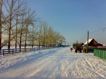Keywords: russia village sky clouds winter snow ice cart cow farm rural road nature outside buildings country