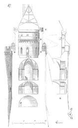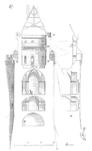 Keywords: Coupe.tour.Charlemagne.Pierrefonds.png Drawings by Eugène Viollet-le-Duc Castle La coupe faite sur <i>ab</i> fig 57 explique l'importance de cet étage au point de vue de la défense Sur l'aire A étaient accumulés les projectiles propres à être lancés par les mâchicoulis pierres rondes cailloux de toutes grosseurs jusqu'à 40 centimètres de diamètre puisque les trous des mâchicoulis ont 42 centimètres environ Cet amas de projectiles pouvait à la rigueur atteindre le niveau du chemin de ronde B en laissant un vide dans le milieu pour le service et pour le passage des hommes par la porte C Dictionnaire raisonné de l'architecture française du XI<sup>e</sup> au XI<sup>e</sup> siècle ~ 1856 Eugène Viollet le Duc Viollet-le-Duc |
