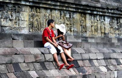 Keywords: couple boy girl sitting resting persons java indonesian budha buddhist buddhist temple temple stupa stone history world heritage architecture old buildings stone foundation heritage historical building landmark