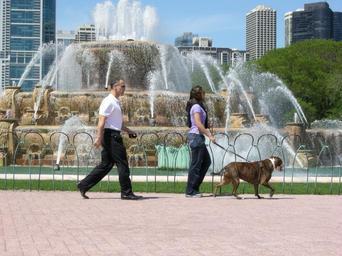 Keywords: Couple walking dog at Buckingham Fountain.jpg en Couple walking their dog at Buckingham Fountain after the 2009 renovation led by Thompson Dyke and Associates own Marmstrong21 my own work Buckingham Fountain Dog walking Dogs and fountains Mammals of Chicago |