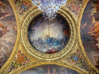 Keywords: versailles ceiling indoor architecture rotunda building The coat of arms are those of the kingdoms of France & Navarre (since Henri IV King of Navarre bacome also King of France starting the "Bourbons" of Louis XIII & XIV dynasty that replaced the "Capétiens" one) The lady in the blue mantle with the shield is the allegory of France distributing her civilization benefits to European people. At the bottom of the photo, the lady with the helmet features Europa. She raises the cornucopia (from Latin "cornu copiae": horn of plenty) Sur la Coupole du Salon de la Paix, la France est peinte sans un char d'argent tiré par quatre tourterelles conduites par des amours. On y trouve aussi les allégories de l'immortalité, de la religion, la piété, l'innocence, la concorde, l'abondance et la félicité des peuples. Sur la corniche, figurent les pays ennemis désormais amis de la France : L'Allemagne recevant une branche d'olivier, l'Espagne, La Hollande. Sur le côté de l'appartement de la Reine, une femme casquée symbolise l'Europe assise sur diverses armes turques. Elle porte dans sa main droite une thiare et dans sa gauche une corne d'abondance remplie de fruits. Elle est entourée de la Justice et de la Piété ainsi que des génies des arts et des sciences. Source: versailles1687.free.fr/c salonpaix.htm The coat of arms are those of the kingdoms of France & Navarre (since Henri IV King of Navarre bacome also King of France starting the "Bourbons" of Louis XIII & XIV dynasty that replaced the "Capétiens" one) The lady in the blue mantle with the shield is the allegory of France distributing her civilization benefits to European people. At the bottom of the photo, the lady with the helmet features Europa. She raises the cornucopia (from Latin "cornu copiae": horn of plenty) Sur la Coupole du Salon de la Paix, la France est peinte sans un char d'argent tiré par quatre tourterelles conduites par des amours. On y trouve aussi les allégories de l'immortalité, de la religion, la piété, l'innocence, la concorde, l'abondance et la félicité des peuples. Sur la corniche, figurent les pays ennemis désormais amis de la France : L'Allemagne recevant une branche d'olivier, l'Espagne, La Hollande. Sur le côté de l'appartement de la Reine, une femme casquée symbolise l'Europe assise sur diverses armes turques. Elle porte dans sa main droite une thiare et dans sa gauche une corne d'abondance remplie de fruits. Elle est entourée de la Justice et de la Piété ainsi que des génies des arts et des sciences. Source: versailles1687.free.fr/c salonpaix.htm |