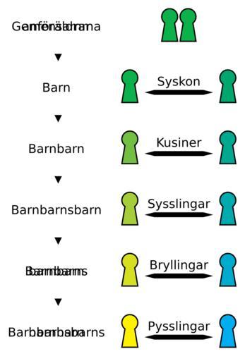 | Keywords: Cousins.svg Relationship diagram of Swedish words for siblings and cousins to the fifth generation There are regional alternatives to this terminology Relationsdiagram över terminologi för inbördes släktskap mellan personer med gemensamma anföräldrar intill femte generationen Dialektala alternativ till terminologin förekommer by dcastor 2010 Dcastor Relationship diagrams SVG diagrams Kinship Family Swedish language | ||||