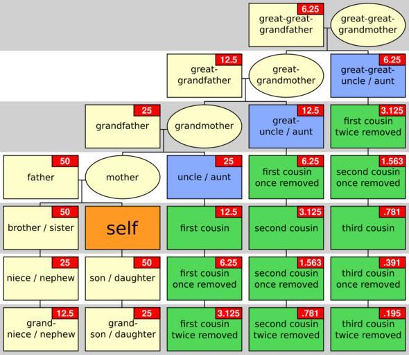 | Keywords: CousinTree kinship.svg en A chart illustrating the different types of cousins including genetic kinship marked within boxes in red which shows the actual genetic degree of relationship gene share with 'self' in percentage File CousinTree svg with kinship values from File Cousin_tree_ with_genetic_kinship png Gringer <span class signature-talk >talk</span> 2010-08-09 Without kinship values PNG version Translation possible Family trees Cousin | ||||