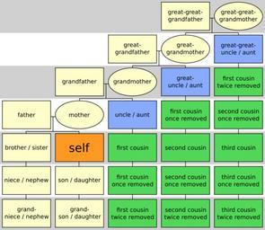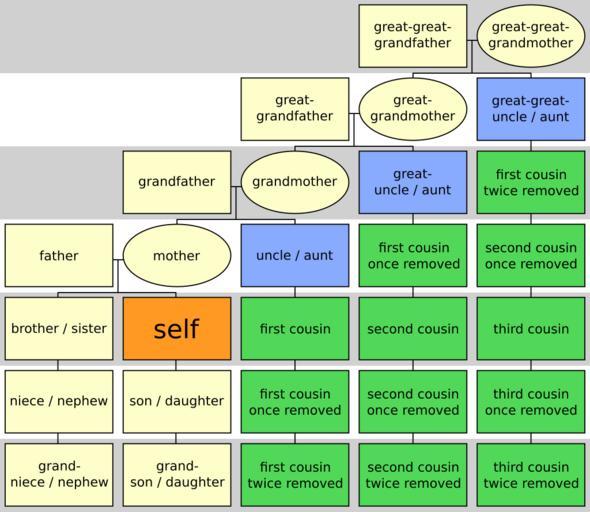 Keywords: CousinTree.svg This is a simple family tree that illustrates the definitions of various types of cousins e g second cousin twice removed own svg version of Cousin tree png 2007-04-20 Matt Leidholm LinkTiger supersedes File Cousin tree png Translation possible Family trees Kinship |