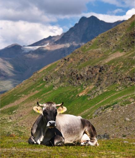 Keywords: cow the alps rest rumination rocks landscape clouds laziness mountains