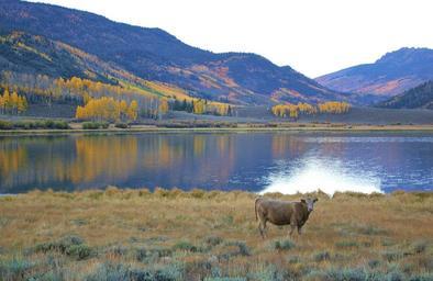 Keywords: cow mountains landscape lake reflections fall autumn water plants grass forest trees woods nature outside colors colorful foliage