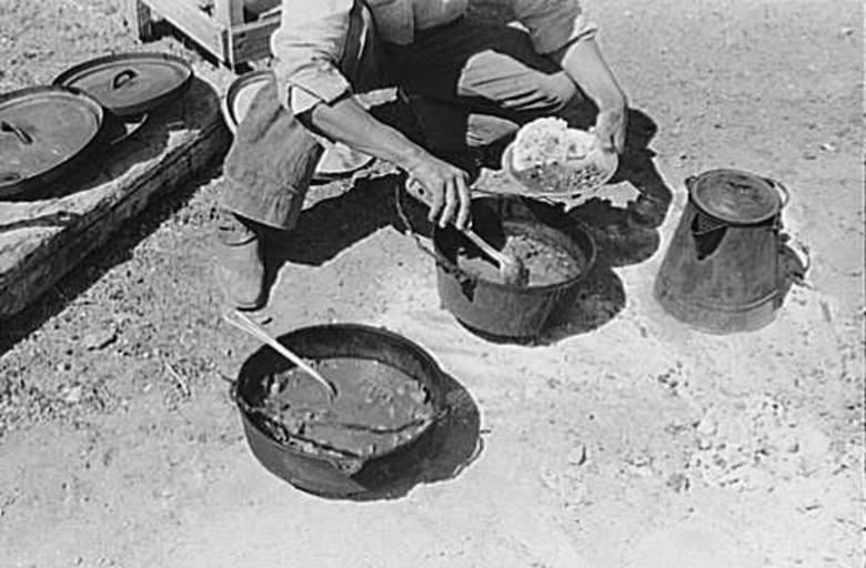 | Keywords: Cowboy dishing up chili.jpg Cowboy dishing up chili at noonday dinner Cattle ranch near Marfa Texas Date May 1939 Photograph Lee Russell Source http //lcweb2 loc gov/cgi-bin/query/r pp/fsaall FILREQ FIELD DOCID+ LIT fsa1997026180/PP + FIELD COLLID+fsa PD-USGov cooking History of the United States |