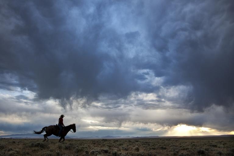 Keywords: cowboy horseback riding west horse silhouette landscape sky clouds man sunset dusk evening twilight prairie plains outdoors scenic panorama gallop