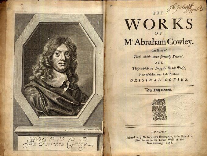| Keywords: CowleyWorks+Frontis copy.jpg Frontispiece and Titlepage to the 1678 Edition of the Collected Works of Abraham Cowley Private Collection of S Whitehead 2007-10-26 Abraham Cowley PD-old Check categories 2008 November 12 en wikipedia Abraham_Cowley ja wikipedia エイブラハム・カウリー Abraham Cowley |