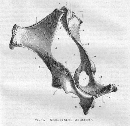 Keywords: CoxauxCheval137ChauveauCM1890.jpg en Pelvis bones coxal bones of the horse Equus caballus lateral view fr Le bassin osseux coxaux du cheval Equus caballus vue latérale os coxal droit et gauche <br /> -1 fosse iliaque Fossa iliaca externe de la face glutéale Facies glutea de l'aile Ala ossis ilii de l'ilium Os ilium <br /> -2 crête iliaque Crista iliaca bord antérieur de l'ilium <br /> -3 col de l'ilium et bord externe de l'ilium <br /> -4 grande échancrure sciatique Insisura ischiadica major formée par le bord interne de l'ilium <br /> -5 épine iliaque ventro-crâniale Spina iliaca ventralis-cranialis angle de la hanche angle externe de l'ilium <br /> -6 épine iliaque dorso-crâniale angle de la croupe angle interne de l'ilium <br /> -7 surface iliaque portant la facette articulaire <br /> -8 crête iléopectinée <br /> -9 acétabulum cavité cotyloïde Acetabulum <br /> -10 épine sciatique crête sus-cotyloïdienne Spina ischiadica <br /> -11 empreinte destinée à l'une des branches du grand droit antérieur de la cuisse <br /> -12 petite échancrure sciatique Insisura ischiadica minor formée par le bord externe de l'ischium Os ischii <br /> -13 symphyse ischio-pubienne <br /> -14 foramen obturé trou ischio-pubien trou ovalaire <br /> -15 pubis Os pubis <br /> -16 arcade ischiatique Arcus ischidiscus arcade ischiale arcade pubienne <br /> -17 tubérosité ischiatique Tuber ischiadiscum <br /> -18 crête de la tubérosité ischiatique <br /> ” Chauveau Auguste Arloing Saturnin Traité d'anatomie comparée des animaux domestiques 1 064 p page 137 1890 Paris Lib J B Baillière et Fils domaine public décès des auteurs 1917 et 1911 Meyer C 2011-03-14 PD-old Horse bones Pelvis |