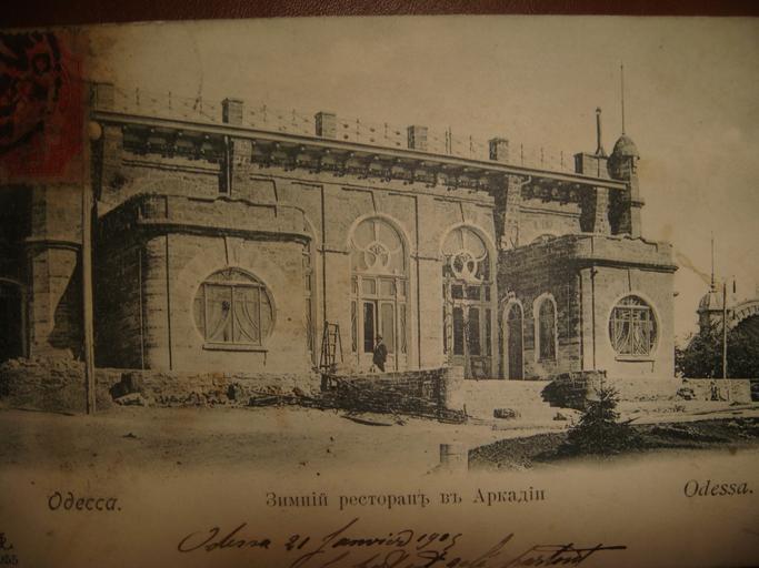 | Keywords: CP Odessa Arcadia winter restaurante.JPG en Old Odessa carte Postale with view of winter restaurante in Arcadia resort ru Почтовая отк ытка начала XX века с видом зимнего есто ана на ку о те «А кадия» в Одессе Ресто ан аботал вплоть до конца XX века В настоящее в емя есто ан зак ыт здание сох анилось но никак не используется A reproduction of post cards dated 20th century scan for original paper postcard // еп одукция почтовой ка точки скан бумажной отк ытки Russian Empire Post; на отк ытке не указан 2010-07-07 Postcards of Odessa Arcadia Odessa Restaurants in Odessa PD-RusEmpire |