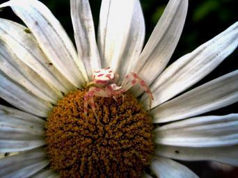 Keywords: crab spider pink and white small arachne daisy white petals yellow centre delicate fragile light